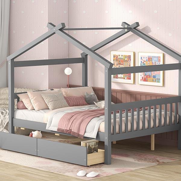 Full Size Wooden House Bed with Drawers, Gray