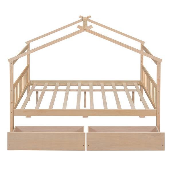 Home > Full Size Wooden House Bed with Drawers, Natural
