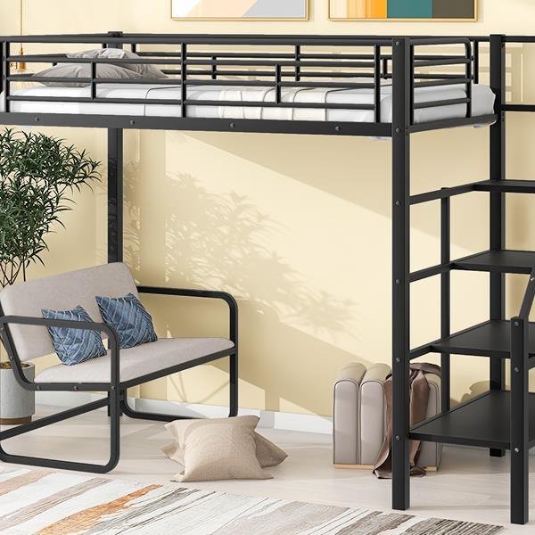 Twin Size Metal Loft Bed with Bench and Storage Staircase, BlackKeep your little child or teen's room clean and safe with a steel frame loft bed, featuring a built-in bench and stairway shelves to keep things tidy. This piece showcases heavy-duty construction that is coated in matte black and keeps your little one's room clean and modern looking.DescriptionMaterialMetal+MDFSizeTwinColorBlacknumbers of package2Spring boxNo needAssembly RequiredYesOriginVietnamDimensionsOverall Product Dimension94.5''L*41.3''W*72''HPackage DimensionPlease refer to the SpecificationLoft Bed Dimension75.2'' x 39''Total height72''Number of Slats20pcsOverall Product Weight124lbBed weight capability250lbRecommend Bed Mattress Thickness6''[with Bench] This bed comes with a metal frame bench, so you don't need to buy bench-like furniture. This bench can be used by two people and comes with a matching cushion set.[Storage Staircase] the staircase can be used as both a staircase and a storage space for you to store daily necessities.[Modern Style] Crafted from metal with a clean paint finish, this bed features clean lines and matching guard rail.[Sturdy Metal Frame] Strong metal frame that includes a staircase, full-length guardrails and secured metal slats to ensure security and stability.[No Box Spring Needed] Due to the system of metal slats, no box spring is required – simply top with the standard mattress of your choice.