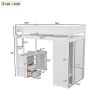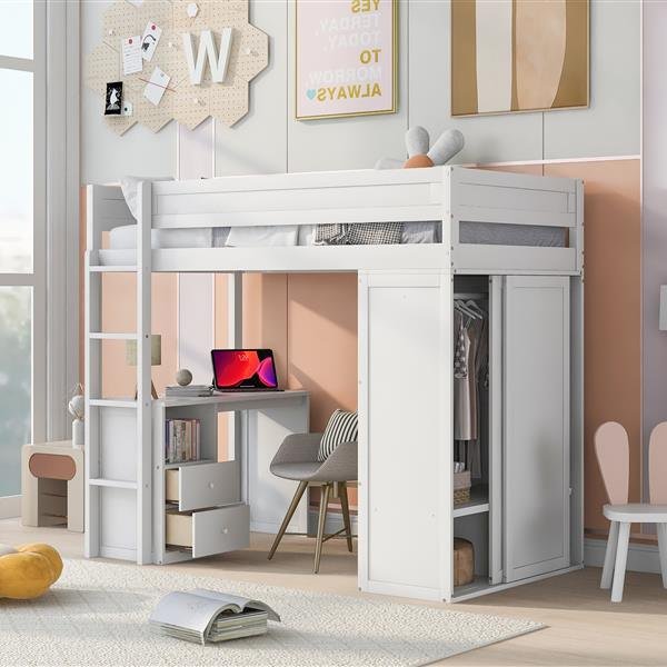 Wood Twin Size Loft Bed with Wardrobes and 2-Drawer Desk with Cabinet, WhiteWardrobe, bed, and desk are three-in-one, this loft bed is a perfect solution to save space. It also gives you a variety of storage spaces, specially thought out for your room. You get a built-in desk, 2 drawers and an open storage cabinet. The multi-functional space under the bed that you can use to keep things out of sight or make into a reading nook for yourself.DescriptionMaterialPine Wood+MDFSizeTwinColorWhiteNumbers of Package3Spring BoxNo needAssembly RequiredYesOriginVietnamDimensionsOverall Product Dimension78.4''L x 40.8''W x 65''HPackage DimensionPlease refer to the SpecificationTwin Bed/Full Bed76'' x 39.3''Total Height65''Number of Bed Slats14pcsRecommend Mattress Thickness of Bed6''Overall Product Weight190.5lbBed Weight Capacity400lb[Storage Space] This loft bed is made up of several pieces: a bed, a desk, a wardrobe, 2 drawers and an open storage cabinet. It can completely store your work and daily necessities.[Space-Saving Design] Wardrobe, bed, and desk are three-in-one, which greatly saves space.[Modern Design] Crafted of solid pine wood and MDF, this loft bed strikes a streamlined silhouette featuring rectangular panels with details.[Designed for safety] Solid framework and firmly fixed wooden slats inside ensure durability, and stability and provide a noise-free environment.[No Box Spring Required] The wood slats support the mattresses not to slide and increase the service life.